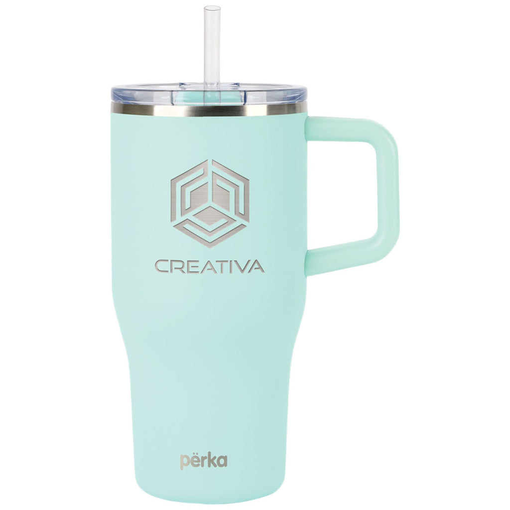 The Perka Aqua Myrton 20 oz. Double Wall, Recycled Stainless Steel Travel Mug is a thoughtful corporate gift for eco-conscious teams or promotional resale. Made from recycled materials, it keeps drinks hot or cold for hours. Its clean, modern design and sustainability message make it ideal for green campaigns or wellness programs.