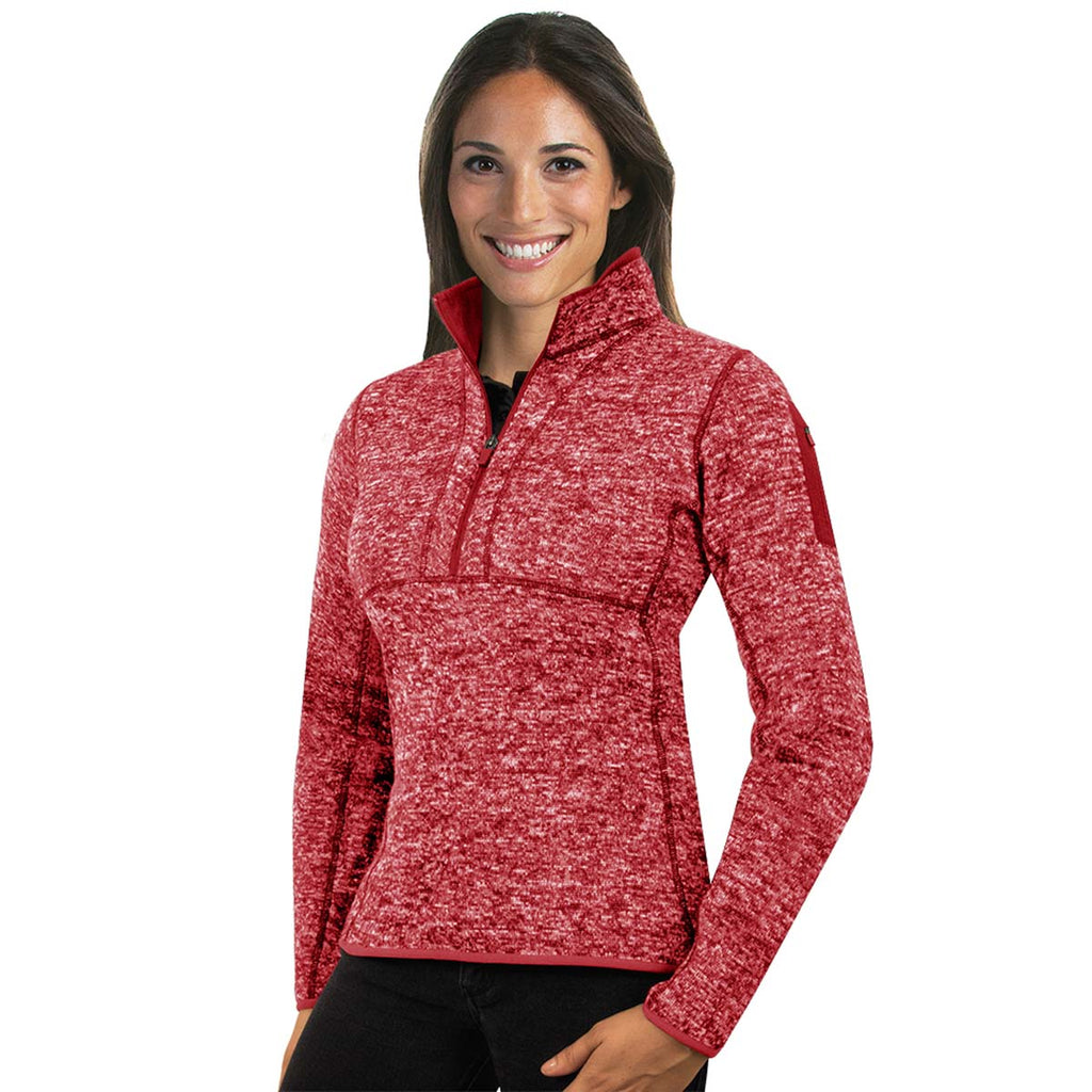 Give away the custom logoed Antigua Women's Dark Red Heather Fortune Quarter Zip before the start of the next company sponsored golf tournament. Make sure to add your embroidered corporate logo to keep your brand in the minds of customer prospects. One-hundred percent brushed back heather sweater knit fabric keeps you comfortable all day long. Dyed to match cover stitch detailing enhances the visual appeal of the sweater-like quarter zip. The interior of the jacket traps body heat to keep you warm on cold weather camping trips. Binding at the cuff, collar, and bottom hem complements the stylish welded sleeve pocket. Your employees will love receiving this custom sweater quarter zip.Corresponding Men's Style: Antigua Men's Dark Red Heather Fortune Quarter Zip