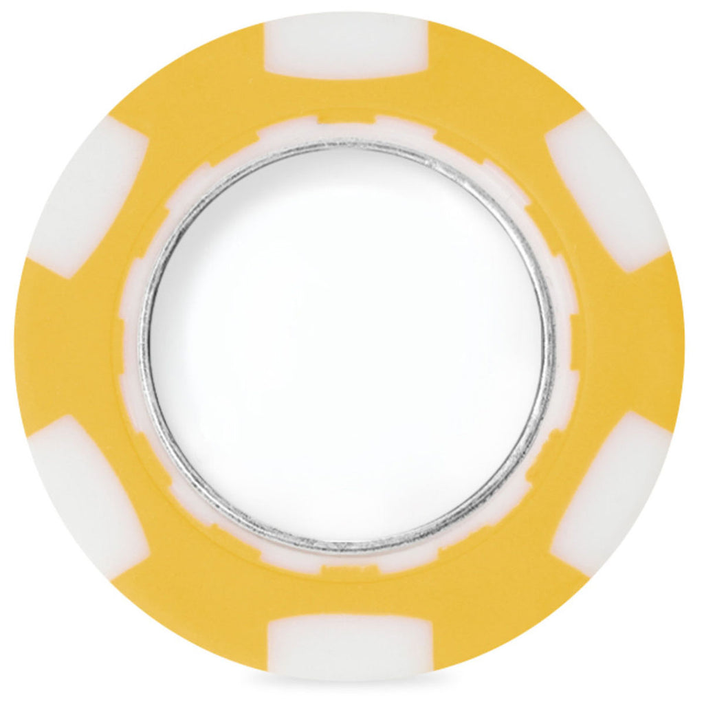 Ahead Yellow/White Poker Chip with Ball Marker with a corporate logo is ideal for tournament play, as the magnetic ball marker sits in the center of the chip. Mark your ball position without interfering with the putting line of others. Get your logo seen each time this marker is used on the course. Ideal for a pro shop impulse buy.The minimum order for this product is 100 pieces.
