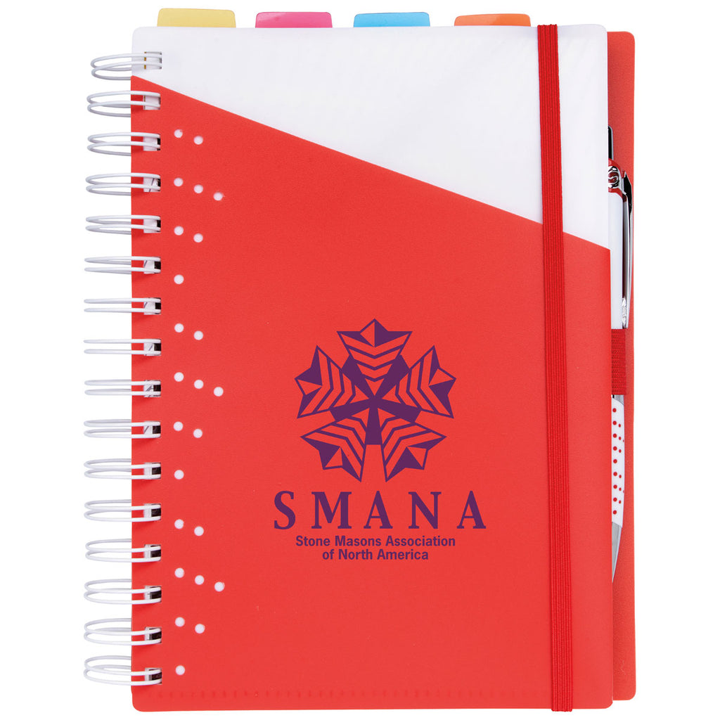 - Plastic color notebook, vertex pen inserted into elastic pen loop, unimprinted, 4 subject dividers with colored tabs and an interior pocket