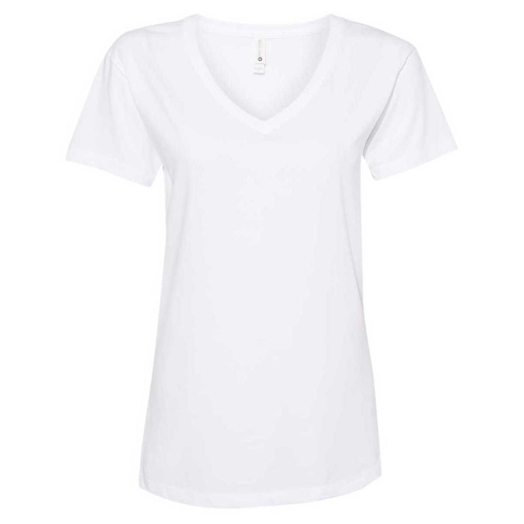 Go beyond basic with a custom screen print Next Level Women's White Fine Jersey Relaxed V T-Shirt. Made of 100% ringspun cotton this straightforward tee has a bit of extra with a V-neck collar in a relaxed fit. Side seams and a tearaway label make this one of the most comfortable tees you can own. Add a custom logo to use for team events or organizations or a company logo to use as part of employee uniforms. Paired with a blazar, this tee could do well as corporate apparel in many settings. The versatility of a simple tee is massive, making this a must have for most wardrobes.Highlights