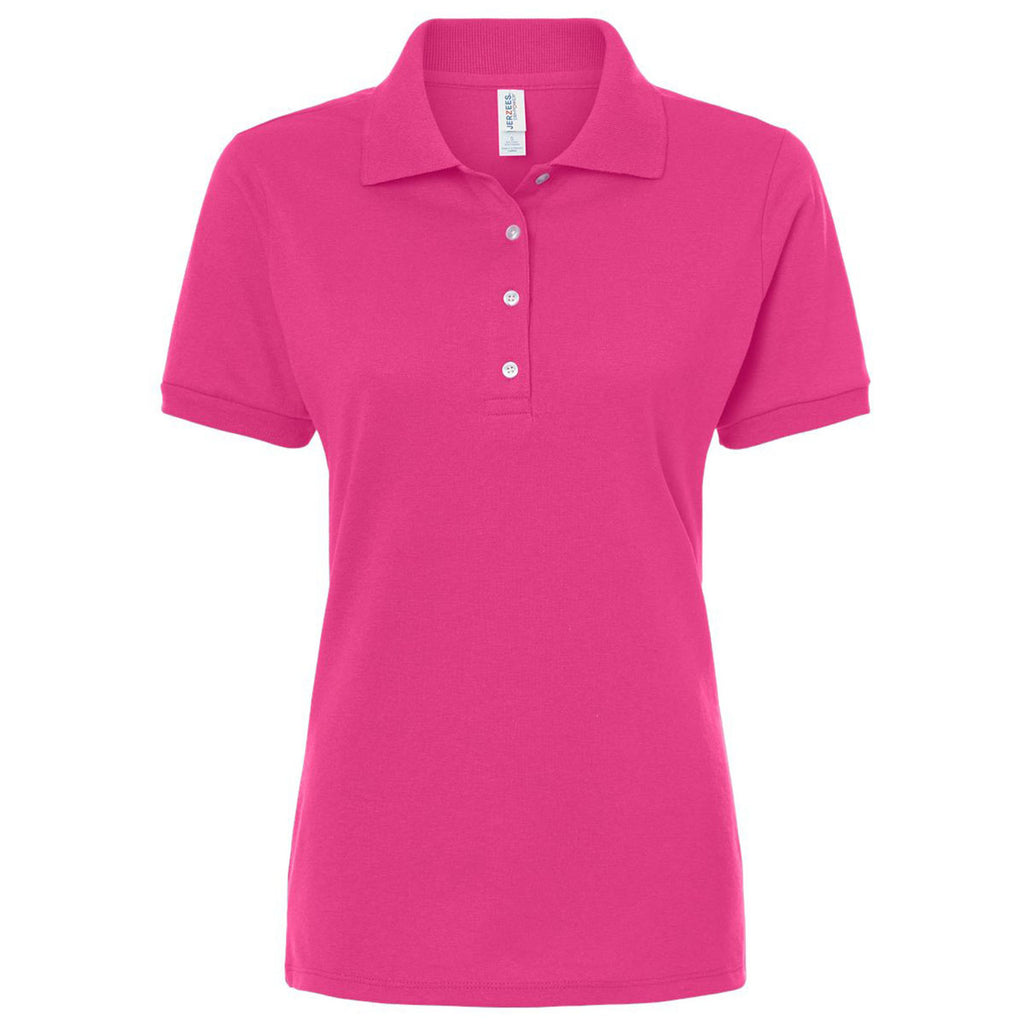 Choose embroidery for the Jerzees Women's Cyber Pink Dri-Power Polo to create a look that works in the office, as a uniform, or as a casual option when you are chilling out or at home. The sustainably sourced material is pre-shrunk with moisture management and a classic feminine fit. The tear-away label means all-day comfort no matter what is on the schedule.Highlights