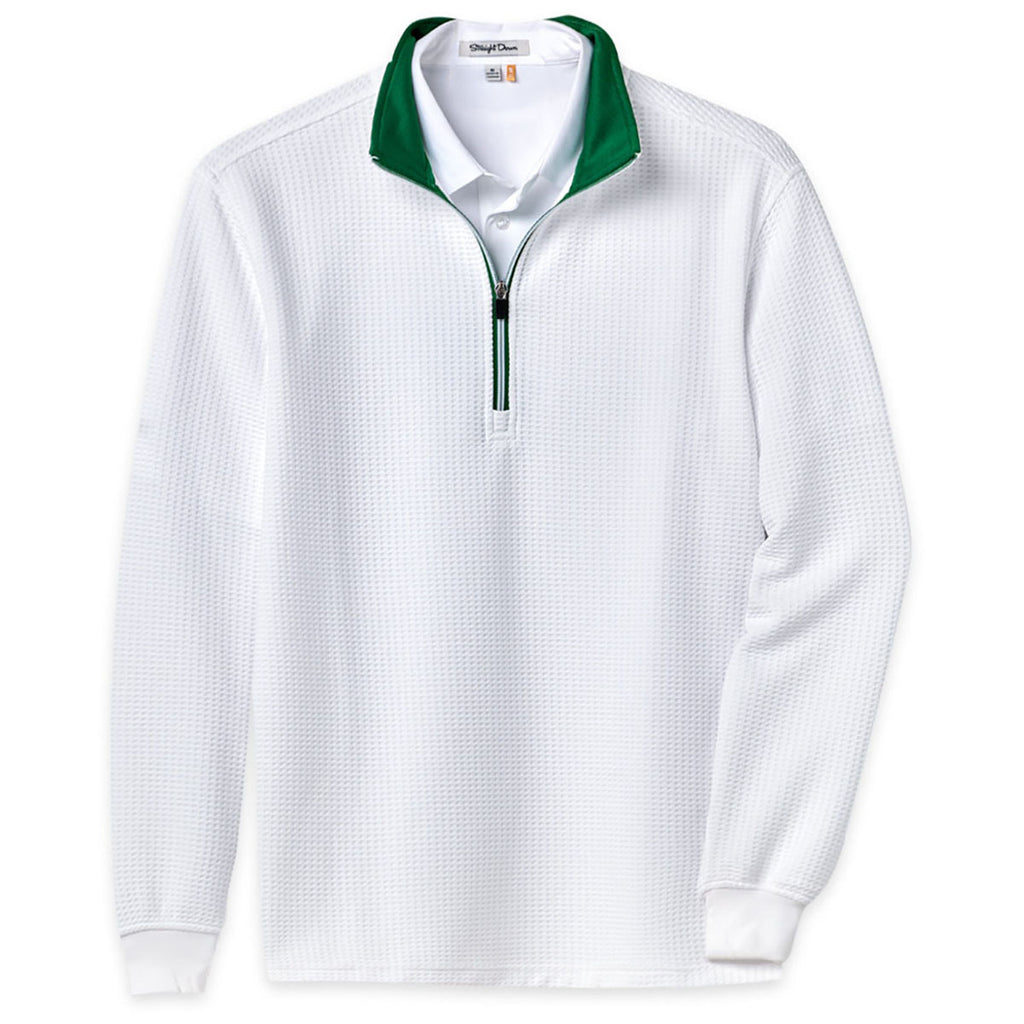 Designed for corporate branding or upscale casual wear, the Straight Down Men's White Verde Optic Quarter Zip stands out with its textured jacquard pattern. The breathable fabric stretches for comfort while providing a tailored look. Easy to layer over polos or tees, it's a go-to piece for team events or travel.Highlights