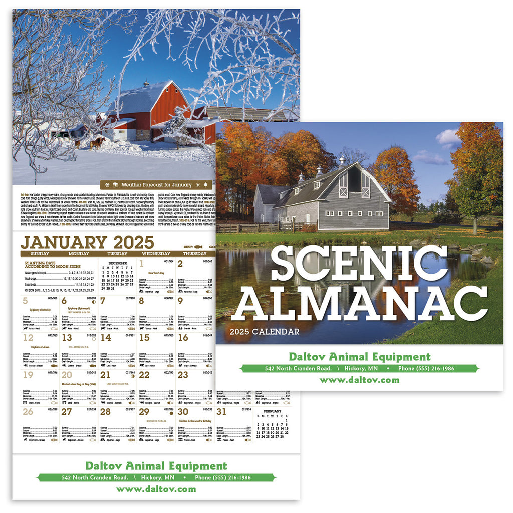 The Triumph Calendars Scenic Almanac with your custom logo will be a weather watcher's dream, with gorgeous weather-based landscapes each month. It is perfect for hanging in an office or home to easily keep track of important dates. Order plenty in time for the upcoming new year to help everyone start things off right.The minimum order for this product is 150 pieces.