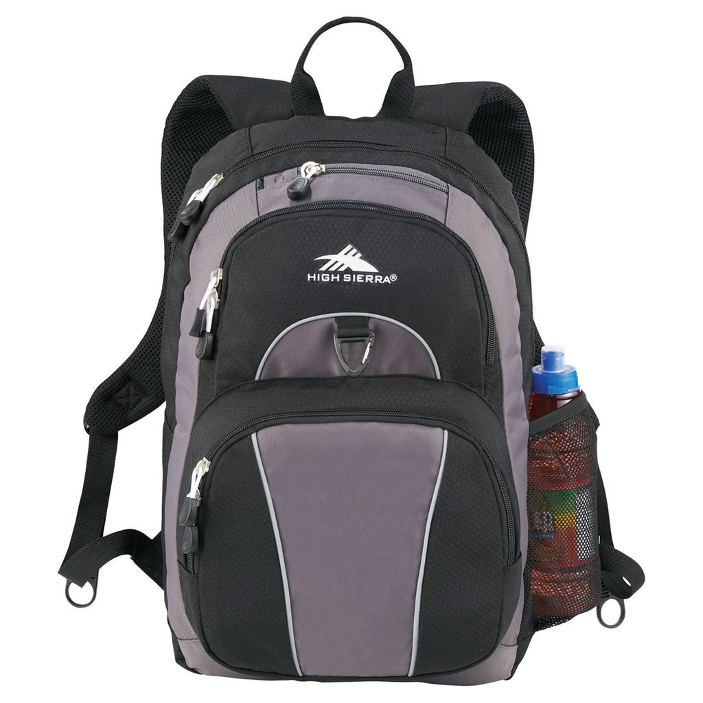 The High Sierra Black Enzo Backpack is great for gym fanatics who need something to carry their workout items with them. Add your gym's logo to the body to produce a full look. The backpack comes with a mesh water bottle holder on the side. The separate compartments around the backpack allow the user to divide up one's items when traveling around.Highlights