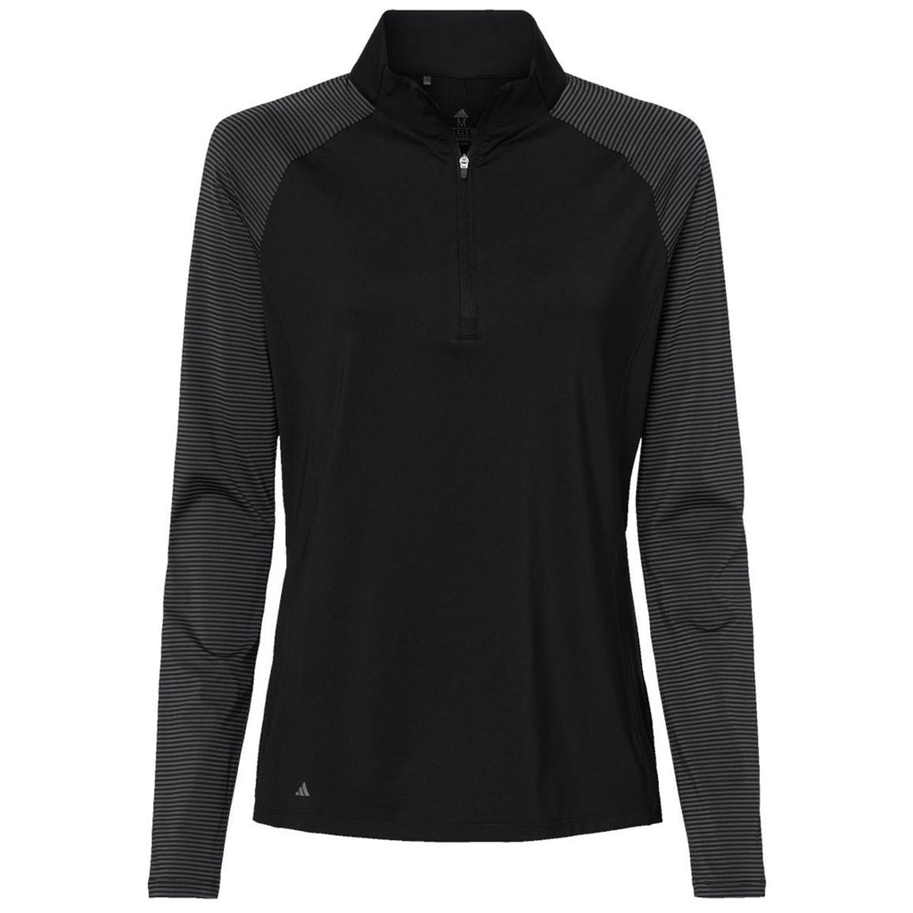 Adidas Women's Black Stripe Block Quarter-Zip Pullover with a corporate logo is a fun way to showcase your company or brand while promoting a healthy lifestyle. This sleek pullover offers moisture-management properties, UPF 50+ protection, and a self-mock collar so you can enjoy a morning jog, play a game of tennis, or hit the gym in style.