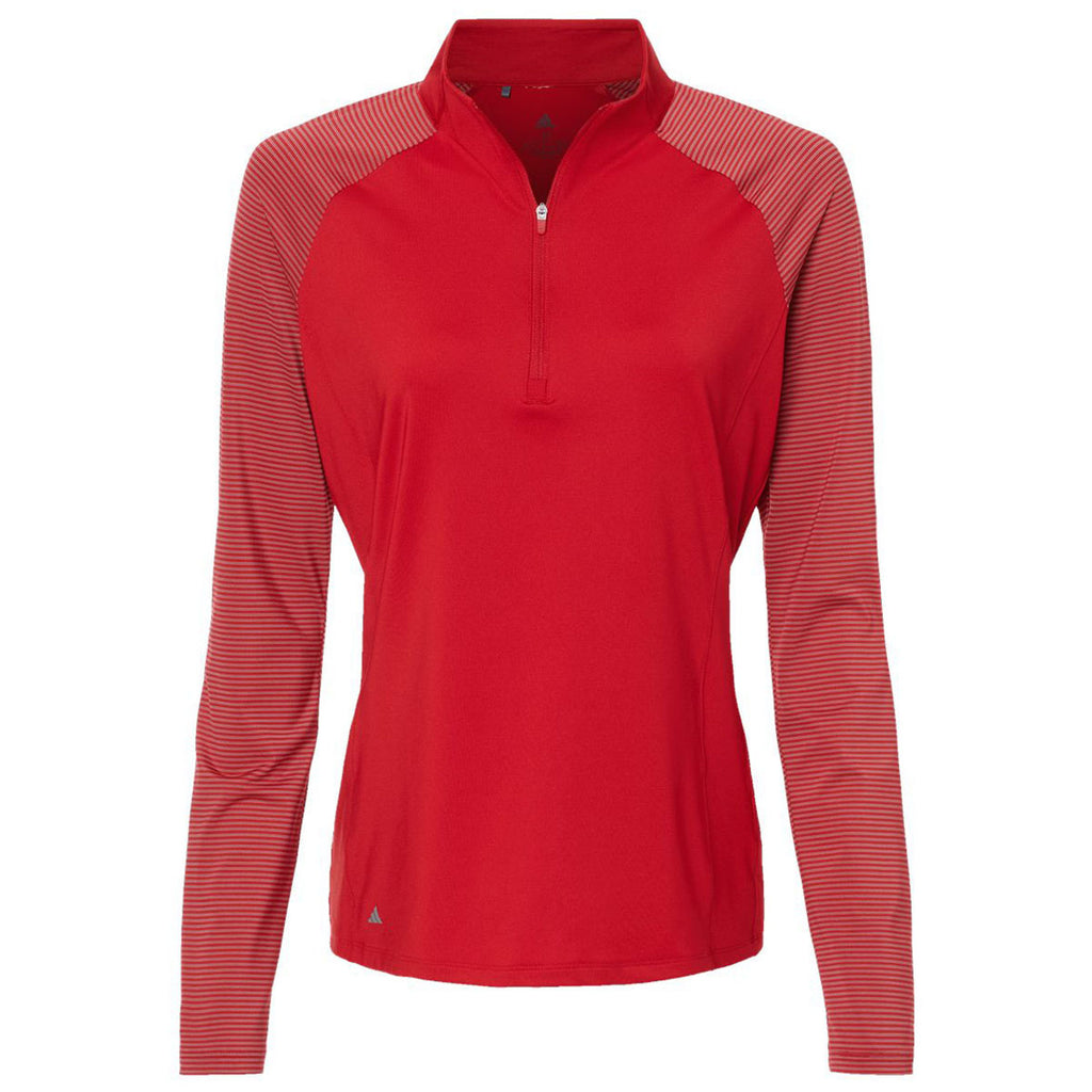 Adidas Women's Team Power Red Stripe Block Quarter-Zip Pullover with a corporate logo is a fun way to showcase your company or brand while promoting a healthy lifestyle. This sleek pullover offers moisture-management properties, UPF 50+ protection, and a self-mock collar so you can enjoy a morning jog, play a game of tennis, or hit the gym in style.This product cannot ship outside of the United States