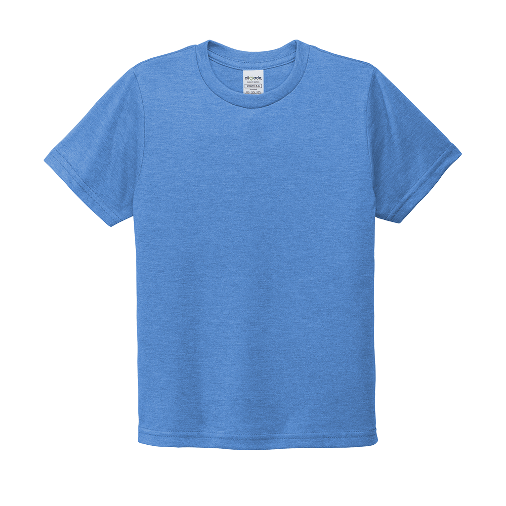 Design a screen print for the Allmade Youth Azure Blue Tri-Blend Tee to create a unique look for your team or organization. The simple recycled apparel is not only great to wear, but good for the environment. Made of sustainable materials that are the equivalent to up to six recycled plastic water bottles. This super soft tee is perfect for youth as they play their hardest each day. Add a custom logo to add to your sustainable clothing line in shops or simply add to your own wardrobe.
