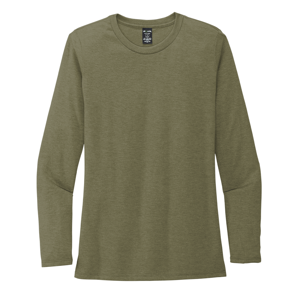 Add screen print to the Allmade Women's Olive You Green Tri-Blend Long Sleeve Tee for a look that everyone can enjoy. Your custom logo will appear on this piece of sustainable clothing that is durable and fashion friendly. Add a company logo to use as employee gifts or uniform pieces in some industries. Easy to wear alone or layer when the weather is cooler, this long sleeve tee should be welcomed into every wardrobe. Recycled apparel is not only durable, but fashion forward while saving the earth. Each tee uses material the equivalent of up to six recycled plastic bottles.