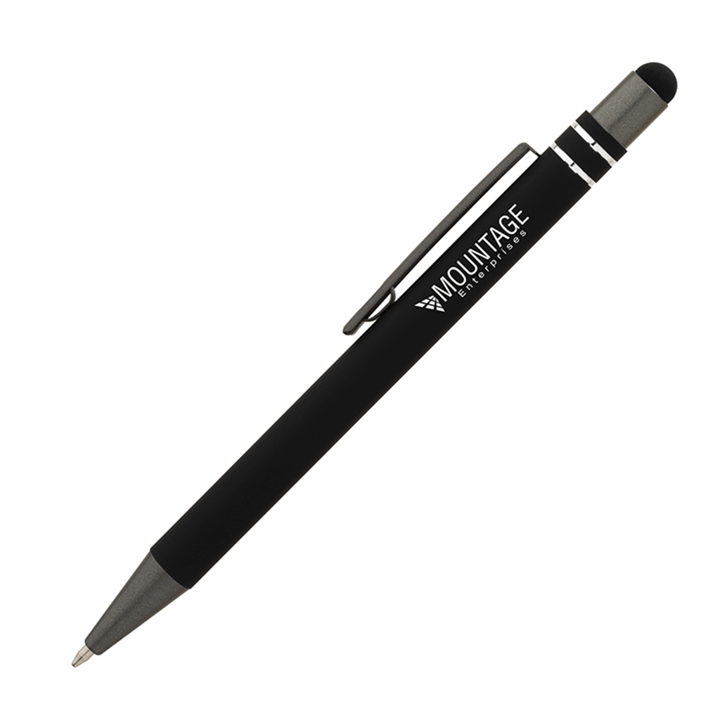 The Black Silvana Soft-Touch Ballpoint Pen with Stylus is a great gift for your new hires. It has black ink, a plunge-action mechanism, chrome trims, and an aluminum body with a soft-touch rubberized finish. This pen has a pocket clip and a capacitive stylus for touch screen devices. It's ideal for notetaking and business meetings.The minimum order for this product is 500 pieces.