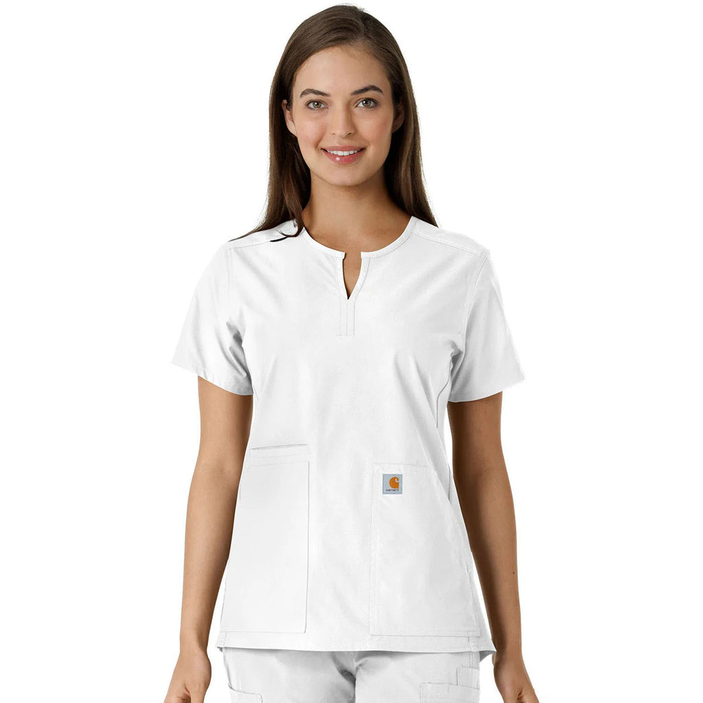 Choose embroidery for the Carhartt Women's White Notch Neck Tunic Knit Panel Scrub Top for a refined look that works as hard as you do. This modern-fitting scrub top has large pockets, a badge loop, and stain release for those messy days. Perfect for the medical or childcare industries, this top is a true must-have.Highlights
