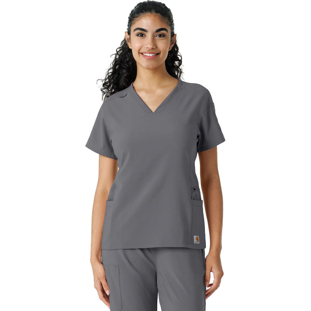 Keep it simple with a corporate logoed Carhartt Women's Pewter Knit Panel Scrub Top. This modern-fitting scrub top has a flattering and functional design with a V-neck, badge loop, and several convenient pockets. Perfect for medical offices of all types or to wear as you clean, relax, or unwind.Highlights