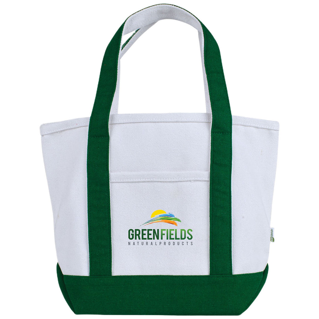 The Logomark Green Roan Mini 24 oz. Recycled Canvas Tote is a custom favorite for boutiques, welcome kits, or eco-friendly events. Made from recycled cotton, it's compact, durable, and reusable. Ideal for carrying essentials, packaging gifts, or adding a sustainable twist to your logoed merchandise.