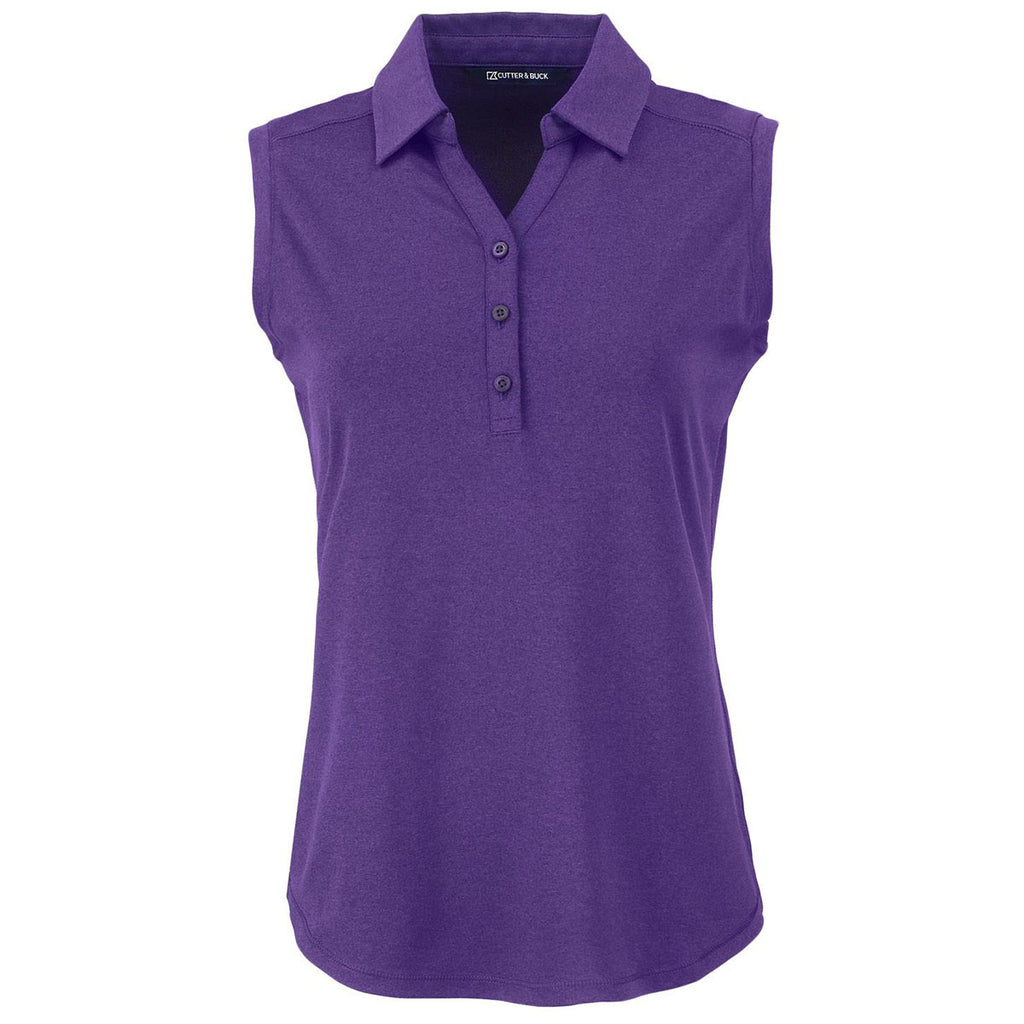 The Cutter & Buck Women's Dark College Purple Heather Forge Eco Stretch Recycled Sleeveless Polo is a fresh, custom-friendly option for active days and warm climates. With stretch performance and recycled materials, it's excellent for branded golf outings, hospitality uniforms, or sustainability-focused retail. The sleeveless design offers breathable comfort with effortless polish.Corresponding Men's Style: Cutter & Buck Men's Dark College Purple Heather Forge Eco Stretch Recycled Polo