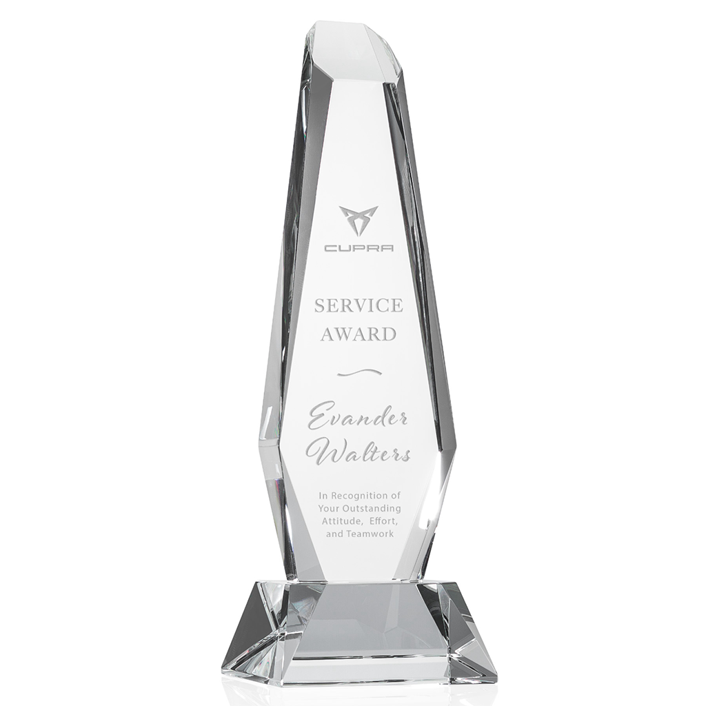 The St. Regis Clear Rawlinson Award on Base 14" is a monolithic optical crystal statue of excellence. With angular, beveled sides and top, this dazzling recognition sculpture is a sight to behold.The minimum order for this product is 1 piece.