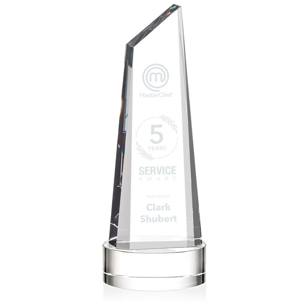 • Stunning trapezoidal tower award is anchored with a thick optical crystal bottom that tapers to a peak.
