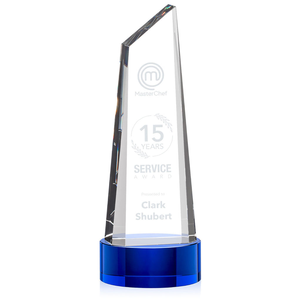 Create a custom message for the St. Regis Blue Akron Tower Award 5" x 14" x 5" with Base - Laser Engraved to give an award that is as special as the recipient. This trapezoidal tower is anchored with a thick optical crystal bottom that tapers to a peak to create an eye-catching design. Perfect for companies, services awards, or sporting championships.