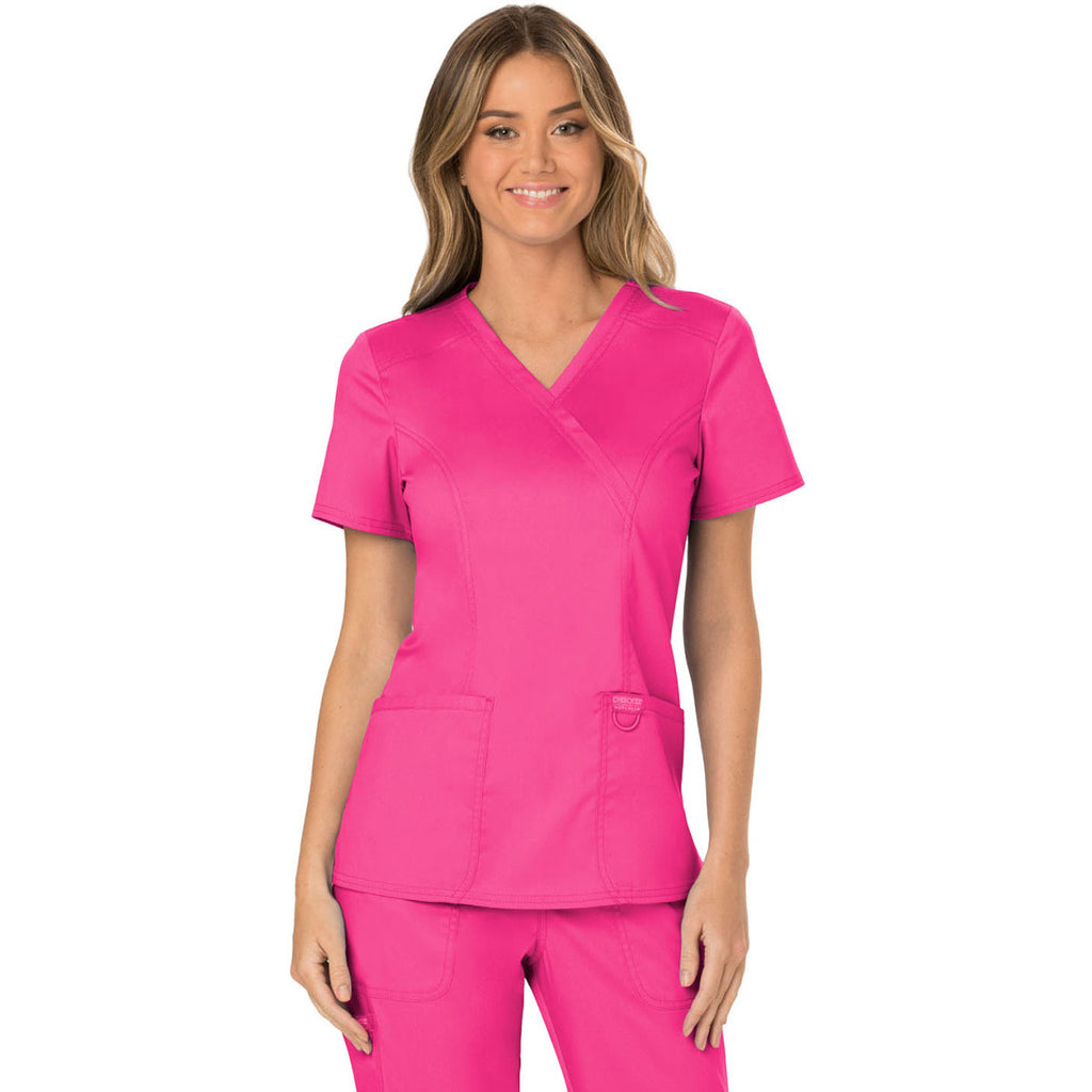 Take healthcare fashion to the next level by wearing the Cherokee Women's Electric Pink Workwear Revolution Mock Wrap Top when it is time to unwind after a grueling day at the clinic. Front and back princess seams present a distinguished appearance that gets you noticed for all of the right fashion reasons. The sleek mock wrap top includes side vents to enhance the appearance of the corporate apparel, as well as circulate air to keep you body comfortably cool. Patch pockets provide quick access to the tools you need for common medical procedures. Add your company logo to get the word out about your world-class medical facility.Highlights