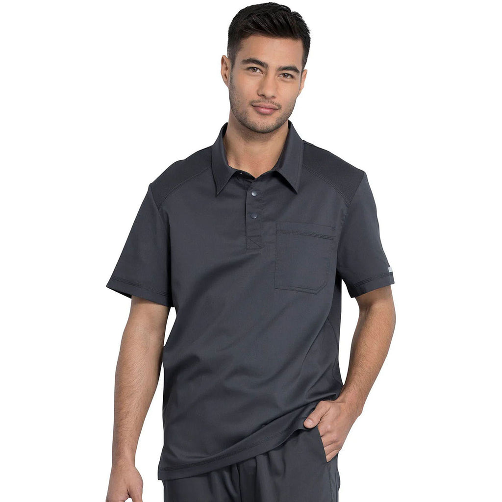 Enjoy an updated classic with a corporate Cherokee Men's Pewter Polo Shirt. This sleek, modern, sporty collared polo features a breathable mesh at the shoulders for added comfort and mobility. A single chest pocket adds convenience whether wearing this with scrub bottoms, on the golf course, or chilling with friends.Corresponding Women's Style: Cherokee Women's Pewter Tuckable Snap Front Polo Shirt